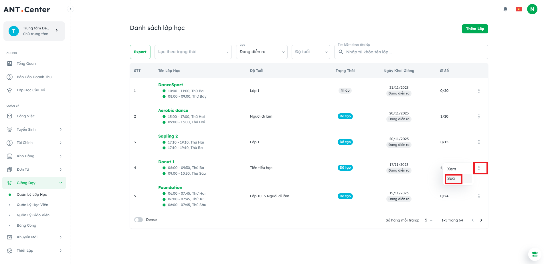 * Tại <mark style="color:red;">**Thanh Menu**</mark> => Chọn <mark style="color:red;">**Giảng dạy**</mark> => Click <mark style="color:red;">**Quản lý lớp học**</mark> => Chọn lớp học muốn thêm buổi