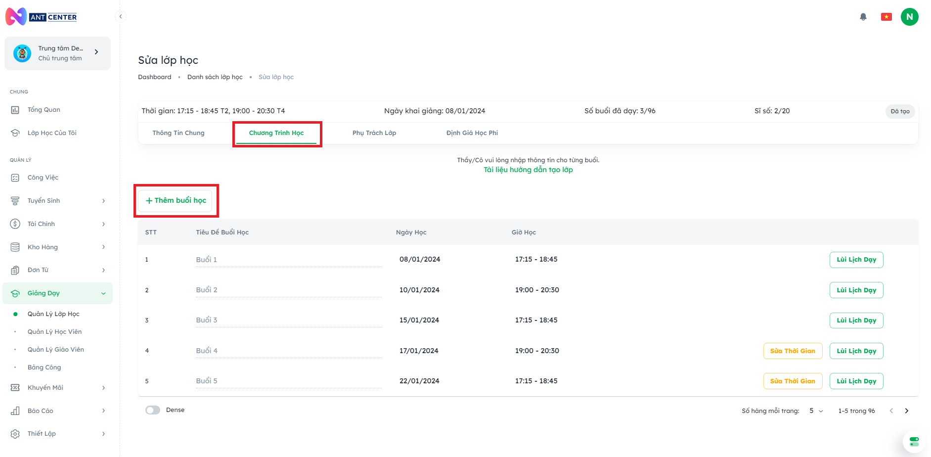Chuyển tab <mark style="color:red;">**Chương trình học**</mark> => Click <mark style="color:red;">**Thêm buổi học**</mark>